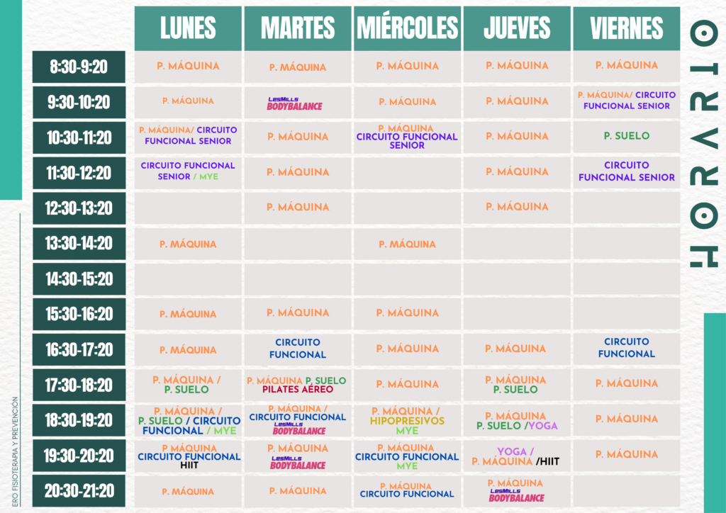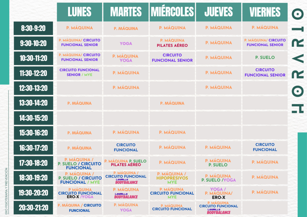 Si te interesa participar en nuestras actividades y aún no sabes si tu horario te lo permitirá, te dejamos a continuación nuestro horario semanal de clases para que puedas empezar a organizarte ☺️